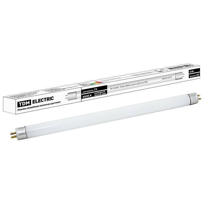 Лампа люминесцентная линейная двухцокольная ЛЛ-16/6 Вт, T5/G5, 4000 К, длина 226,3мм TDM