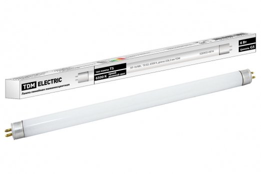 Лампа люминесцентная линейная двухцокольная ЛЛ-16/6 Вт, T5/G5, 6500 К, длина 226,3мм TDM