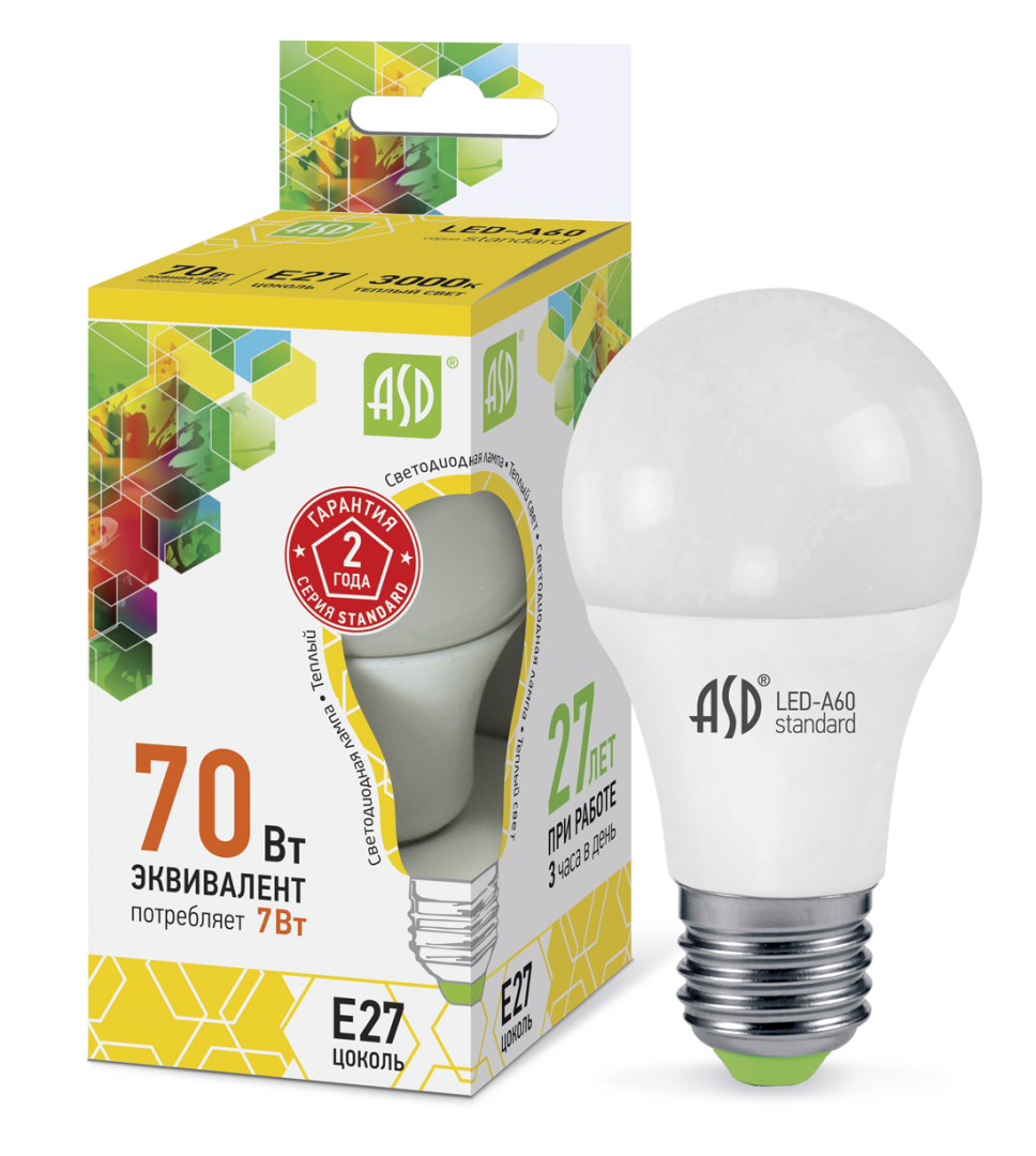 Лампа светодиодная LED-A60-standard 7Вт 230В Е27 3000К 630Лм ASD