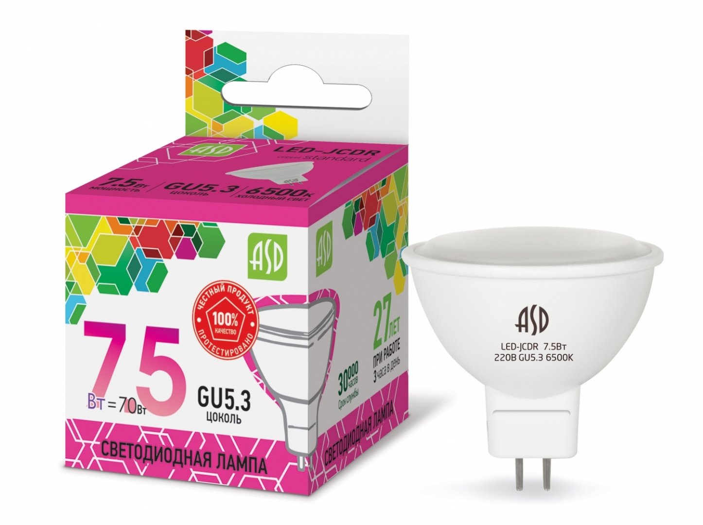 Лампа светодиодная LED-JCDR-standard 7.5Вт 230В GU5.3 6500К 675Лм ASD