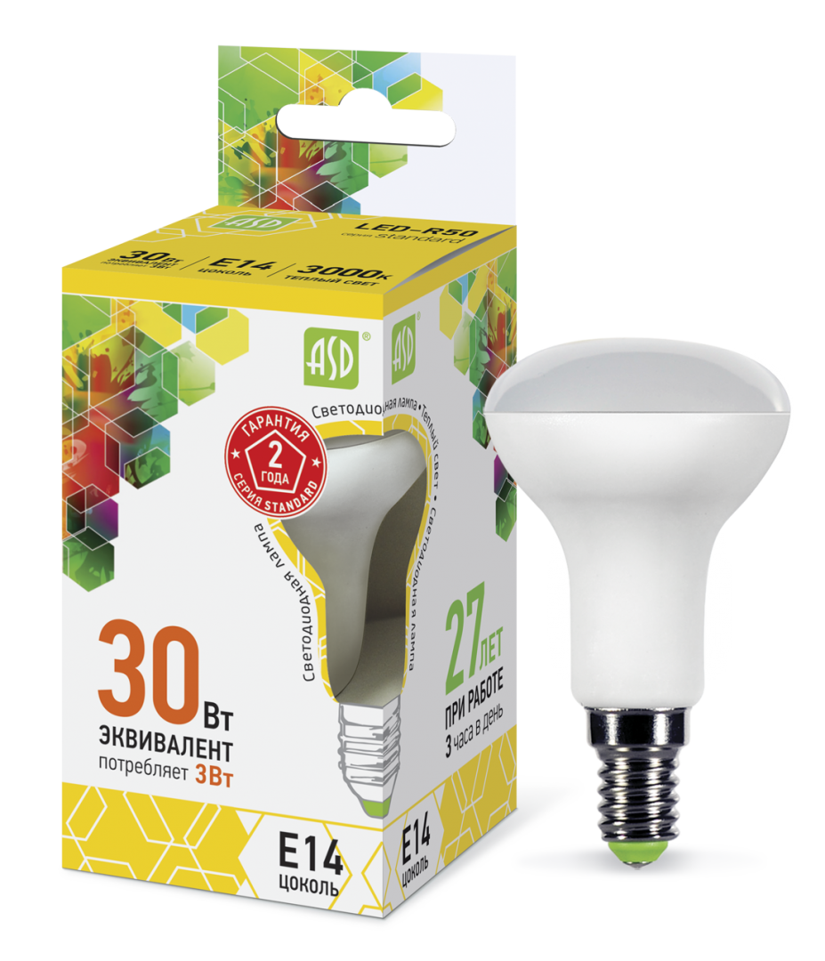 Лампа светодиодная LED-R50-standard 3Вт 230В Е14 3000К 270Лм ASD
