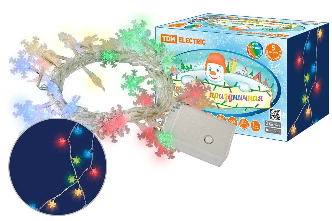 Гирлянда светодиодная "Снежинки" 50LED, 5м, 8 режимов, многоцвет., прозр. шнур, 250 В, TDM
